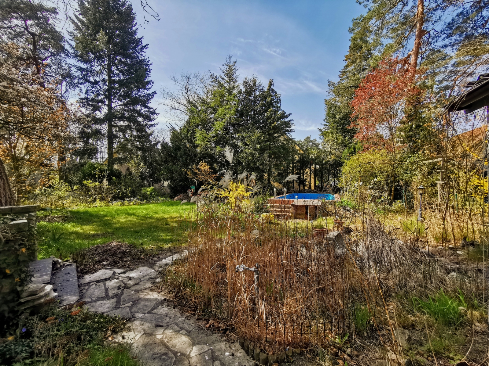 Das Haus hat eine bebaute Fläche im EG von ca. 112qm, das entspricht ca. 92qm Wohnfläche, die sich im Hochpattere aufteilt in Flur, Küche, Wohnzimmer, Schlafzimmer, kleines Zimmer, Bad, Gäste-WC. Im Souterrain (ca. 92qm) befinden sich zur Wohnnutzung ausgebaut ein Gästezimmer, ein Bar/Partyraum, ein Esszimmer, sowie ein Hauswirtschaftsraum und eine Werkstatt/Lager. Das Dachgeschoss verfügt derzeit nur über eine max. Höhe von ca. 130cm und ist daher zur Zeit nur als Abstellfläche genutzt, es besteht jedoch die Möglichkeit ein Dach mit 45 Grad Neigung zu errichten und das Dachgeschoss mit ca.85qm zu weiteren Wohnräumen auszubauen. Das Haus verfügt über eine ca. 100qm große Terrasse (Südwest Lage) die teilweise überdacht ist. Im hinteren Garten befindet sich neben zahlreichen wertvollen Pflanzen und Gehölzen eine Rasenfläche zum sonnen und spielen, außerdem ein Teich mit Wasserpflanzen und ein 3m x 6m großer Swimmingpool, der ins Gelände integriert ist. Durch die nach hinten versetzte Lage hat das Haus seitlich keine Nachbarbebauung, ein eventueller Neubau im Vorgarten würde auch keine Beeinträchtigung mit sich bringen da dieser auf der Nordostseite des Hauses entsteht und deswegen nur Nebenräume nach vorne ausgerichtet sind. Die Kaufpreisvorstellung für das Haus mit ca. 835qm Grundstücksanteil liegt bei 1.125.000€